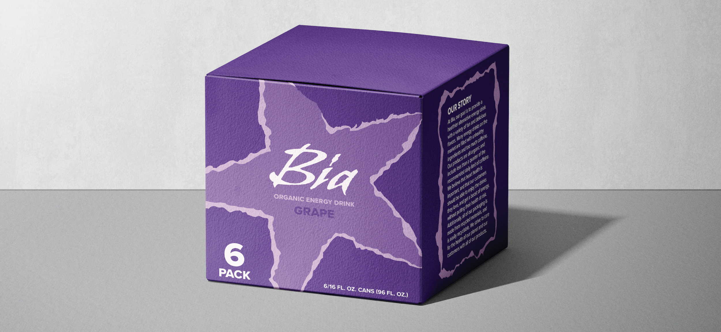 I decided to create an organic energy drink brand that focused on sustainability and heart health. Many of the most popular energy drinks use unhealthy ingredients; even many organic energy drinks contain too much caffeine. I wanted this brand to only use organic and ethically sourced ingredients, and to limit the amount of caffeine, so consumers would not have to worry about going over the recommended daily limit. Additionally, the packaging would be sustainably made and recyclable. Words I associated with this brand are bold, bright, sustainable, accessible, and fun. The name I chose, Bia, refers to the Greek goddess of strength and power.