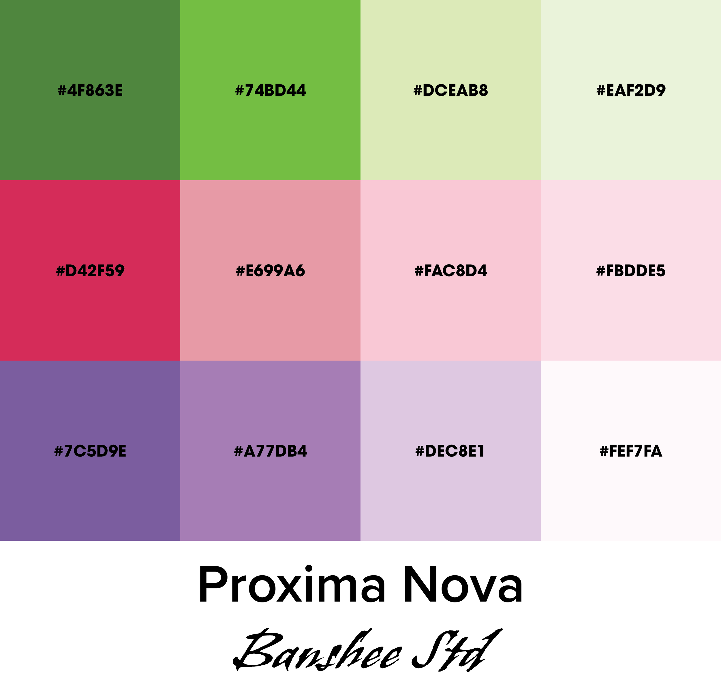 The three flavors I chose were grape, strawberry, and lemon lime, which are represented by monochromatic purple, pink, and green designs, respectively. For the logo, I used the font Banshee Std to convey an energetic feel, and for the body text I used Proxima Nova, which balanced out the logo.